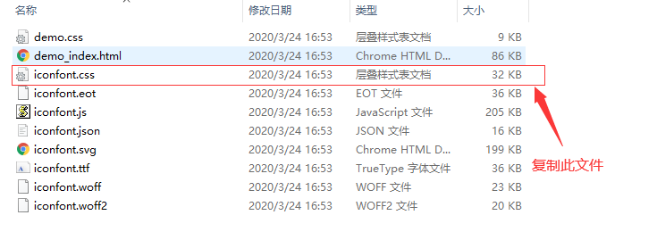 - 复制"iconfont.css"至项目,一般放在根目录的