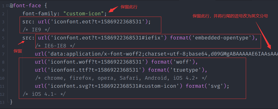 当然,每次新增图标,当您把"iconfont.css"复制至项目中覆盖原来的"iconfont.css"后,都需要执行一遍第5步删掉多余的内容,别忘了修改最后的,为;。